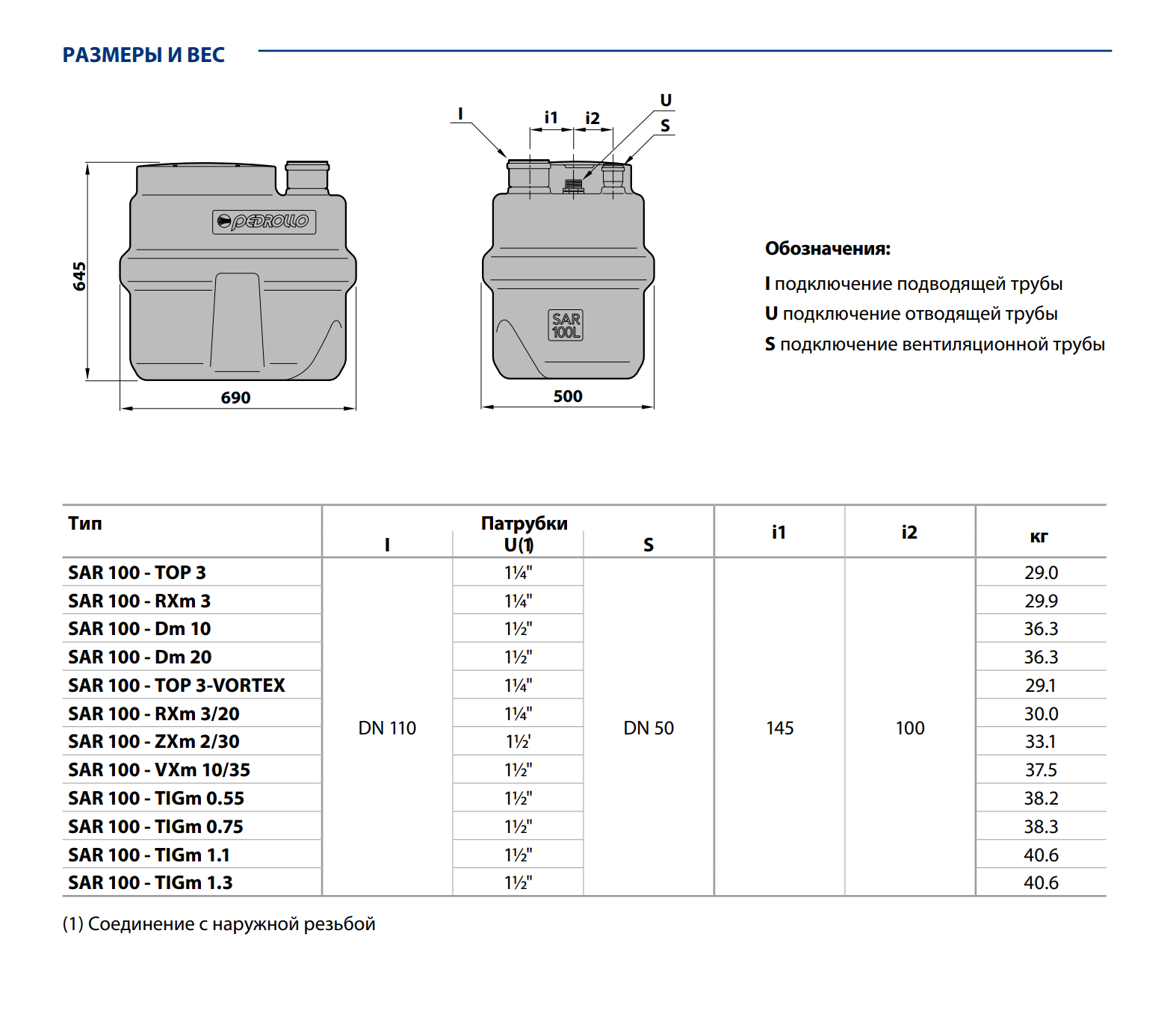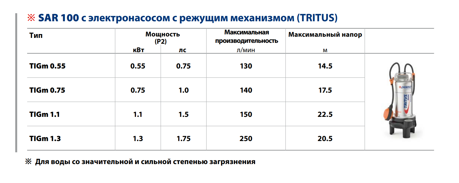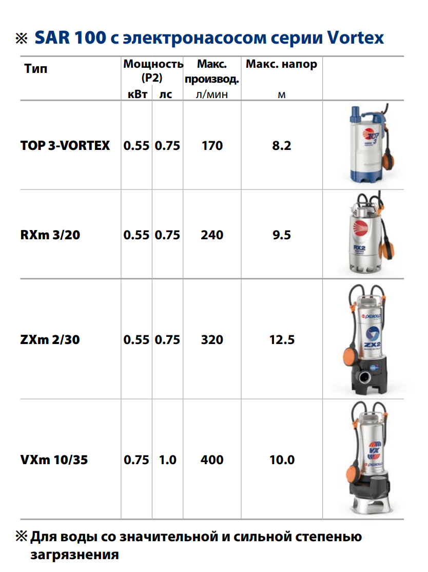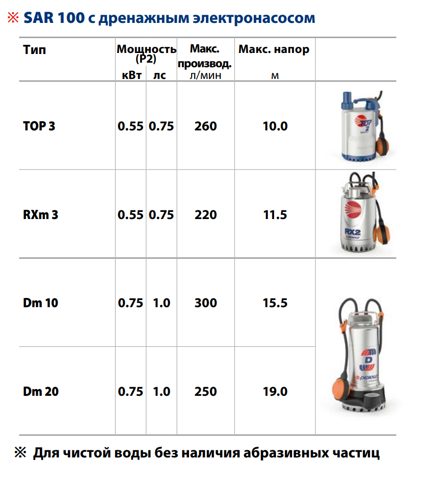 - ※ Накопительная станция SAR 100 укомплектовывается однофазным погружным электронасосом с поплавковым выключателем, что позволяет адаптировать установку под ваши конкретные нужды.