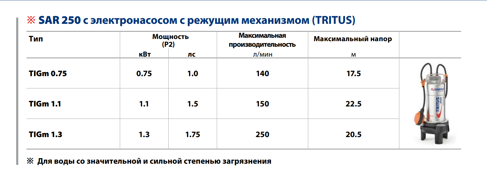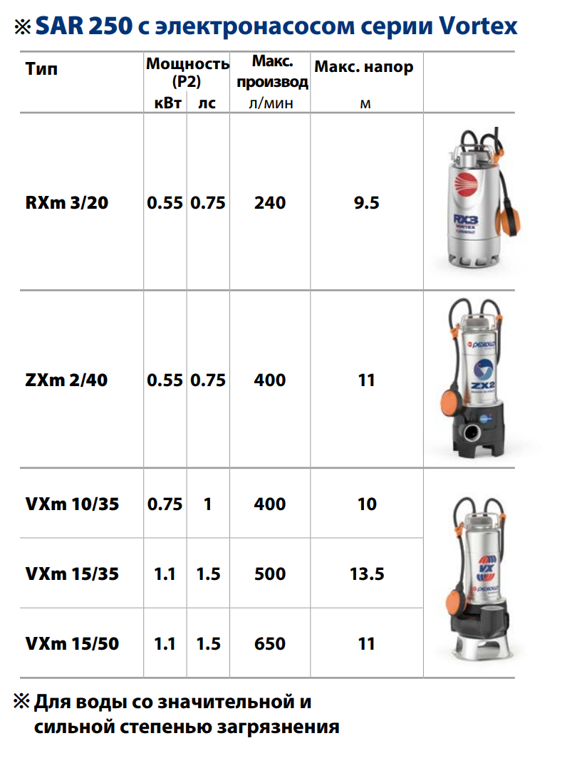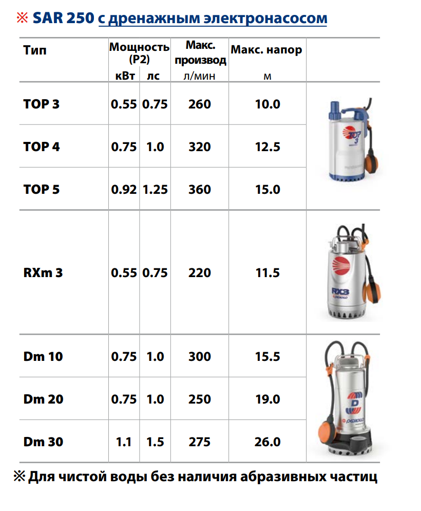 - ※ Накопительная станция SAR 250 укомплектовывается однофазным погружным электронасосом с поплавковым выключателем, что позволяет адаптировать установку под ваши конкретные нужды.