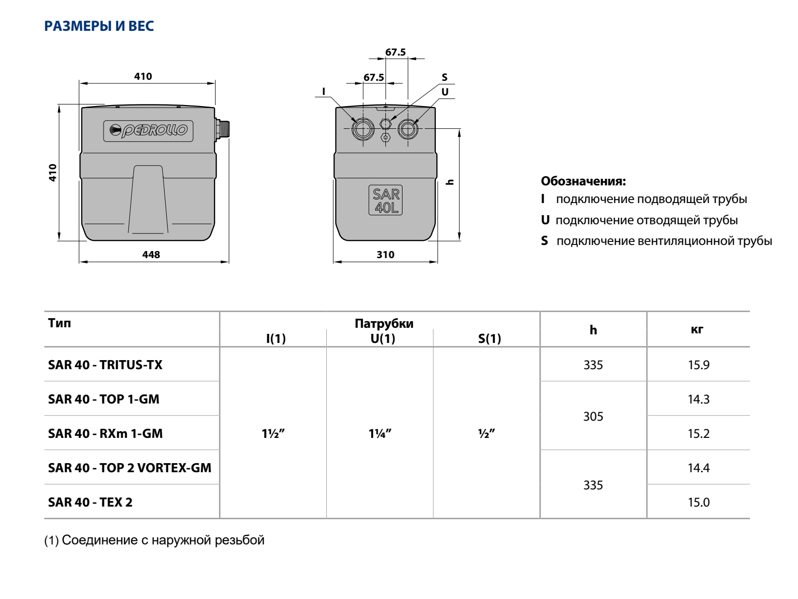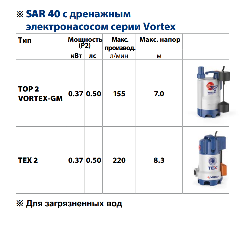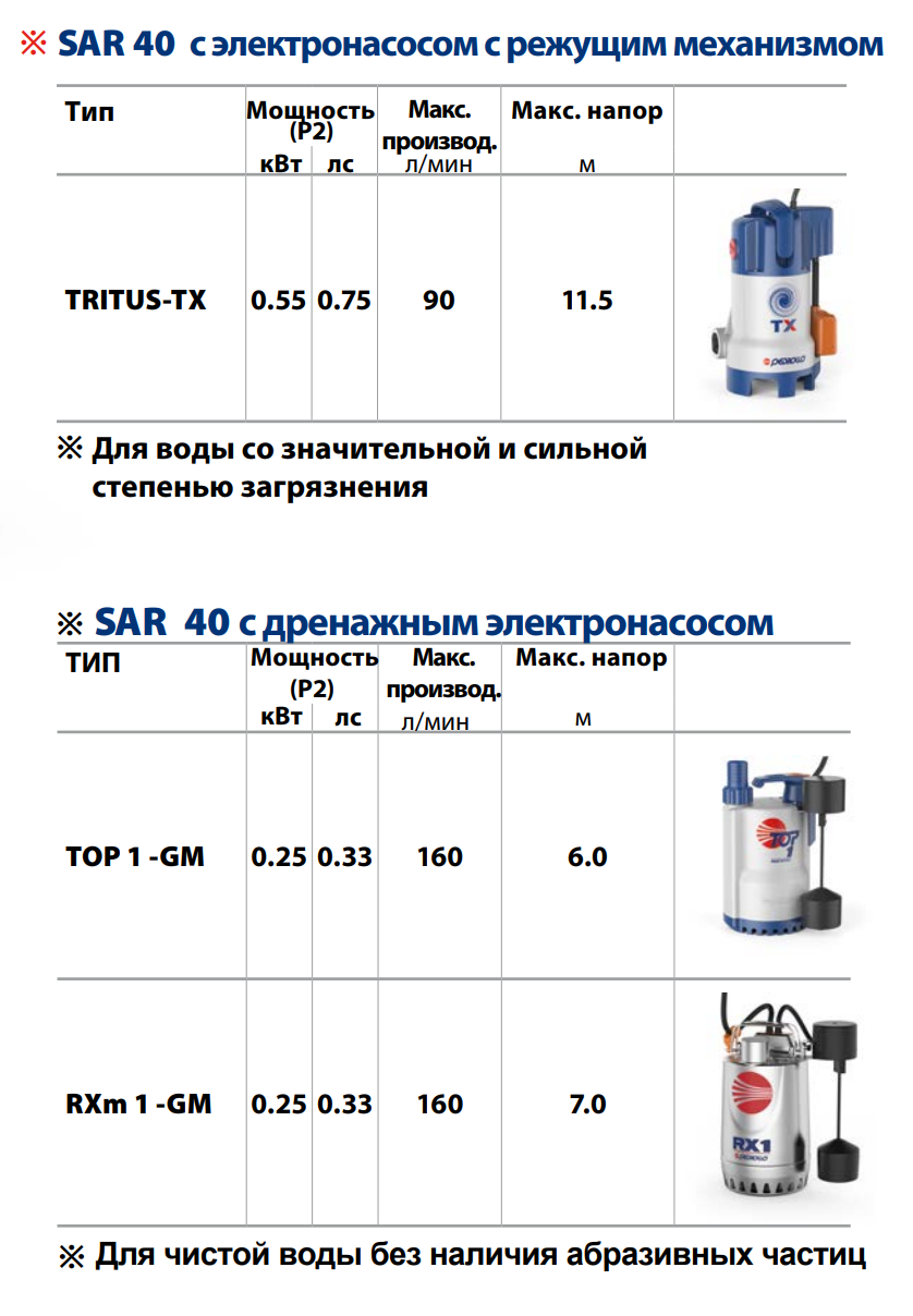 - ※ Накопительная станция SAR 40 укомплектовывается однофазным погружным электронасосом с поплавковым выключателем, что позволяет адаптировать установку под ваши конкретные нужды.