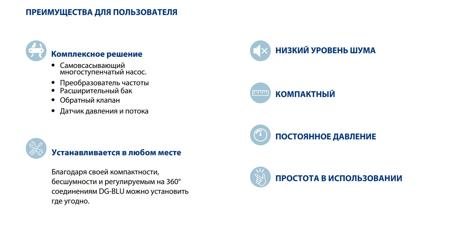 DG-BLU — это современная автоматическая станция повышения давления с высокоэффективным самовсасывающим многоступенчатым насосом. В комплект входят расширительный бак, датчики давления и потока, а также обратный клапан. Станция оснащена сложной инверторной электронной системой управления, которая программно контролирует производительность системы, обеспечивая: – поддержание постоянного давления в зависимости от расхода воды; – контроль гидравлических и электрических параметров для предотвращения неисправностей; – возможность объединения с другим блоком DGBLU с помощью дополнительной платы расширения; – легкую интеграцию в любую, даже существующую, систему повышения давления; – снижение потребления электроэнергии за счет уменьшения пускового и рабочего токов, что позволяет достичь большей энергоэффективности.